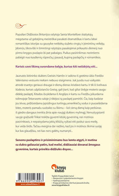 Populiari Didžiosios Britanijos rašytoja Santa Montefiore skaitytojų mėgstama už gebėjimą meistriškai pasakoti dramatiškas ir kartu labai romantiškas istorijas su gausybe netikėtų siužeto vingių ir įsimintinų veikėjų. Įdomūs, tikroviški ir išmintingi rašytojos pasakojimai prikausto dėmesį nuo pirmo knygos puslapio iki pat pabaigos. Puikus pasirinkimas norintiems pabėgti nuo kasdienių rūpesčių į pasaulį, kupiną paslapčių ir romantikos.