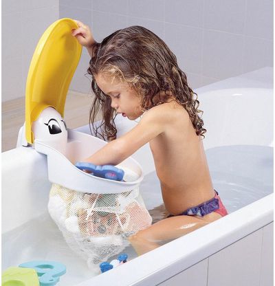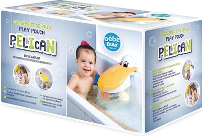 Dar daugiau maudynių džiaugsmo! Šmaikštus pelikano formos krepšys padės taupyti erdvę ir tvarkingai laikyti vandens žaislus vonios kambaryje.