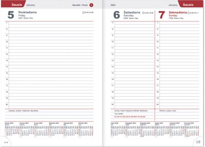 Elegantiškas darbo kalendorius skirtas detaliam darbų ir susitikimų planavimui. Vienas puslapis skirtas vienai dienai, sužymėtas puslapio laikas nuo 7 iki 20 val., suskirstytas kas 30 min. Kalendoriuje pažymėti vardadieniai, valstybinės šventės, saulės tekėjimo ir leidimosi laikas, savaitės, metų diena ir kiek dienų liko iki metų galo. Kiekviename atvarte ir visų metų kalendorius. Spalvotas Lietuvos žemėlapis, spalvotas Europos žemėlapis, pasaulio valstybės, informaciniai puslapiai, papildomi puslapiai kontaktams ir pastaboms.