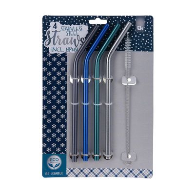 Keturi daugkartiniai, aplinką saugantys šiaudeliai. Rinkinyje yra specialus šepetėlis šiaudeliams plauti.