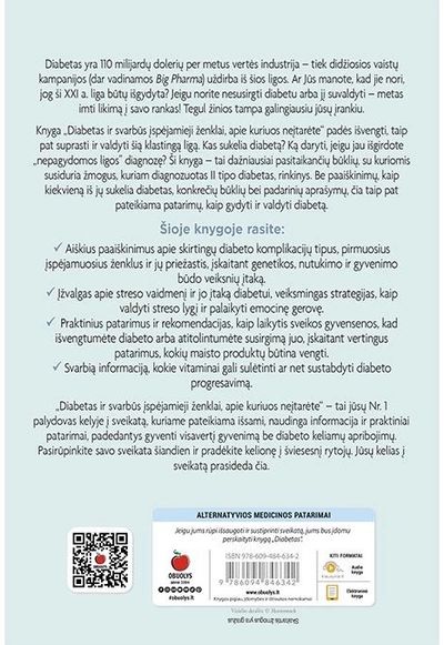 Knyga DIABETAS IR SVARBŪS ĮSPĖJAMIEJI ŽENKLAI, APIE KURIUOS NEĮTARĖTE padės išvengti, taip pat suprasti ir valdyti šią klastingą ligą. Kas sukelia diabetą? Ką daryti, jeigu jau išgirdote „nepagydomos ligos" diagnozę? Ši knyga – tai dažniausiai pasitaikančių būklių, su kuriomis susiduria žmogus, kuriam diagnozuotas II tipo diabetas, rinkinys. Be paaiškinimų, kaip kiekvieną iš jų sukelia diabetas, konkrečių būklių bei padarinių aprašymų, čia taip pat pateikiama patarimų, kaip gydyti ir valdyti diabetą.