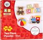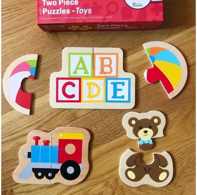 - medinių dėlionių pakuotėje yra 4 dėlionės po 2 detales (meškiukas, traukinukas, kaladėlių piramidė ir kamuolys);