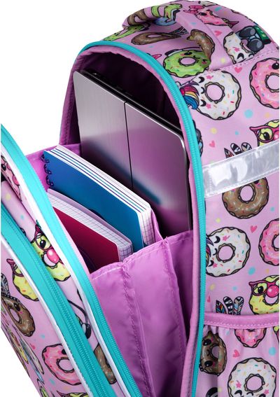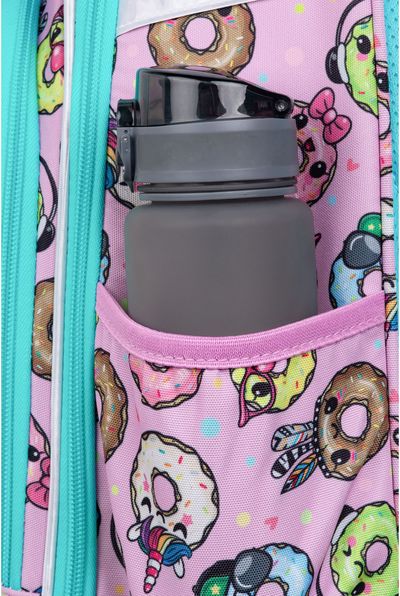 Patogi kuprinė su 2 šoninėmis kišenėmis vandens buteliukui, pagrindiniu talpiu skyriumi didesniems daiktams, knygoms ir priekine kišene patogia smulkiems daiktams.
