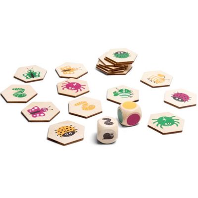 Užverskite visus 18 medinių žetonų su vabalais ir meskite kauliukus. Kas pirmasis rado atitinkantį gyvūną, tas ir laimėjo. Dėžutėje yra 18 medinių detalių su vabalais, 2 kauliukai ir praktiškas krepšys.