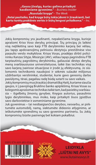 „Jokių kompromisų" mus įtraukia į dramatišką Haitį, kur siaučia gaujos, ir į pavojingą Bruklino banko apiplešimą, kur Krisas Vosas su kolegomis taikė aprašomas technikas tam, kad pasiektų svarbiausia – išgelbėtų žmonių gyvybes. Knygos autorius, pasaulinio lygio derybininkas, mus moko, kaip pritaikyti šiuos įgūdžius savo darbovietėse ir kitose asmeninio gyvenimo srityse.
