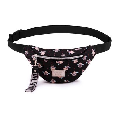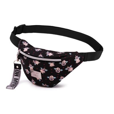 Kompaktiškas juodos spalvos juosmens krepšys su žaviais mopsų piešinėliais. Diržo ilgis reguliuojasi pagal individualius poreikius. Talpiame užtraukiamame skyriuje nesunkiai sutalpinsite visus reikalingiausius daiktus bei smulkmenas.