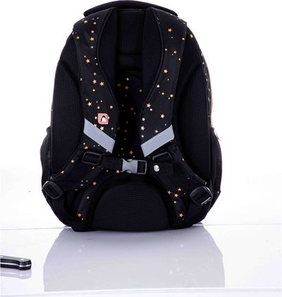 Patogi kuprinė su 2 šoninėmis kišenėmis vandens buteliukui, pagrindiniu talpiu skyriumi didesniems daiktams, knygoms ir priekine kišene patogia smulkiems daiktams.