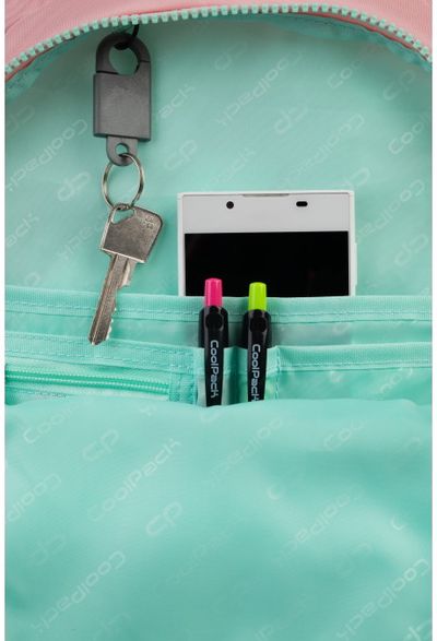 Priekyje Yra kišenė telefonui ir tvarkyklė, vieta pakabinti raktams.