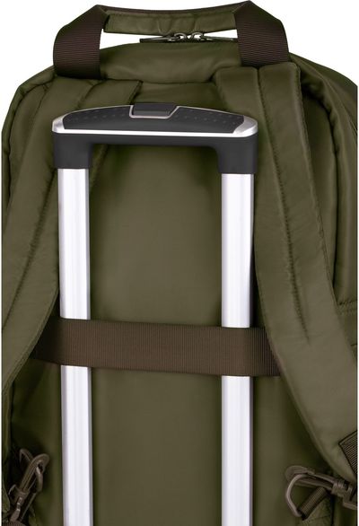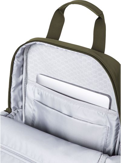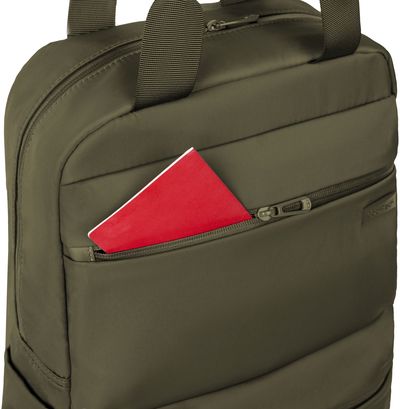 Patogi kuprinė su šoninėmis kišenėmis vandens buteliukui, pagrindiniu talpiu skyriumi didesniems daiktams, knygoms, kompiuteriui ir priekine kišene patogia smulkiems daiktams.