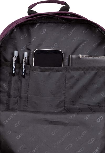 Patogi kuprinė su 2 šoninėmis kišenėmis vandens buteliukui, pagrindiniu talpiu skyriumi didesniems daiktams, knygoms, kompiuteriui ir priekine kišene patogia smulkiems daiktams.