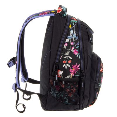 Kuprinė su gėlių akcentais padailintu dizainu. Pagaminta iš vandeniui atsparios medžiagos, su paminkštintomis, reguliuojamomis petnešomis. Kuprinėje yra 2 pagrindiniai skyriai su užtrauktukais, dvi priekinės užtraukiamos kišenės. Priekinės kišenės viduje yra papildoma užtrauktuku užsegama kišenė. 2 šoninėse kišenėse galima laikyti vandens buteliukus ir smulkesnius daiktus. Viršuje prisiūta rankena, skirta kuprinę pakabinti arba nešti.