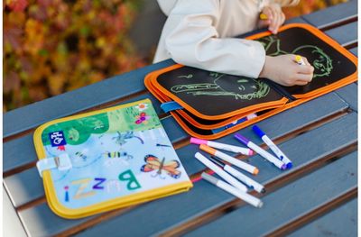 Pieškite ant knygelės puslapių pridedamomis kreidelėmis, nuvalykite ir kartokite.
