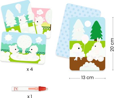 Komplektą sudaro 4 nuotraukos (13 x 20 cm) ir praktiškas vandens rašiklis. Vaikai gali pakartoti veiklą tiek kartų, kiek nori.