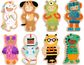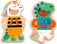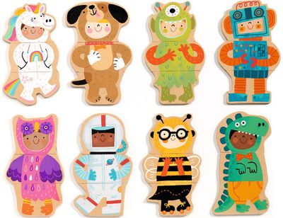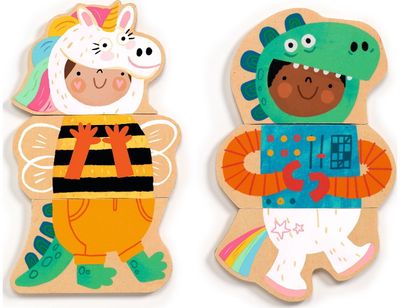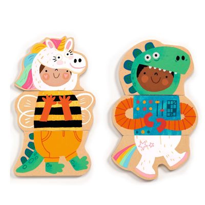 24 magnetinių medinių detalių rinkinys, iš kurių galima sudėlioti 8 skirtingus personažus.