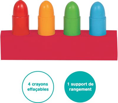 Sušlapusios kreidelės piešia. Galima piešti ant veidrodėlio, vonios ar plytelių. Kreidelės yra tinkamo dydžio mažiems pirščiukams, taip pat patogiai susideda į dėkliuką.