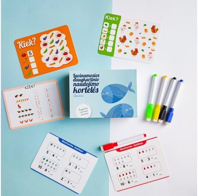 Rinkinyje taip pat rasite flomasterius, su kuriais vaikas galės rašyti ant kortelių, viską nutrinti ir vėl kartoti užduotėles.