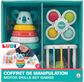 Atraskite šią žaislų dėžutę, kurią sudaro 3 kūdikių suktukai, piramidės sudėjimo žaidimas (sudarytas iš 3 spalvotų žiedų ir 1 centrinio strypo) ir manipuliavimo kubas (kubas, papuoštas susipynusiomis juostelėmis ir 10 spalvotų formų). Spalvinga dėžutė sužadina vaikų susidomėjimą. Suktukų veikimo principas yra paprastas: stumkite ranka ir suktukai apsisuka naudodami rutulinį guolį.