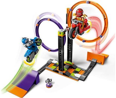 Vaikai nuo 6 metų gali renti įspūdingus pasirodymus, žaidimus ir varžybas su šiuo LEGO® City Besisukančio kaskadininkų iššūkio (60360) rinkiniu, kuriame yra sukiojamas dvigubas šuolio žiedas, 2 rampos ir 2 smagračiais varomi motociklai. Tiesiog įtrauk 2 LEGO City „Stuntz“ vairuotojus ir pradėk linksmybes.