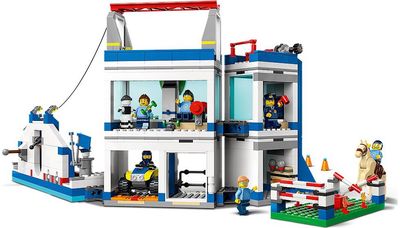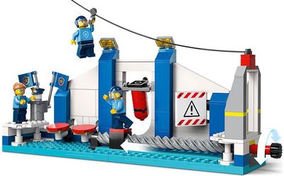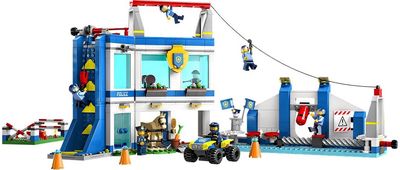LEGO® City Policijos treniruočių akademijos (60372) rinkinį sudaro modulinė kelių patalpų policijos nuovada ir kliūčių ruožas lauke su smagia įranga, įskaitant žaislinę kopimo sienelę, skersinius ir nusileidimo lyną. Be to, jame yra keturratis, 6 minifigūrėlės ir arklio figūrėlė.