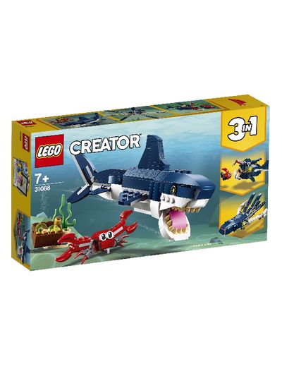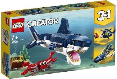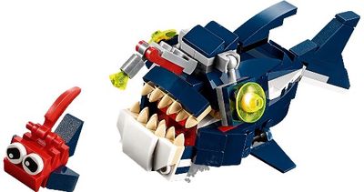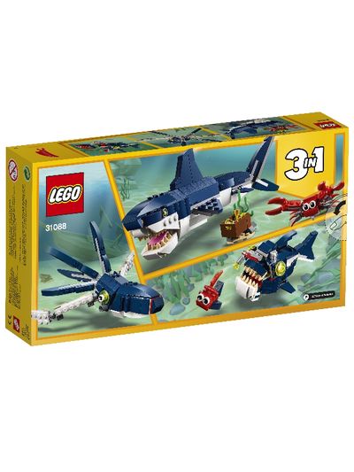 Sukonstruok ir perkonstruok ryklį, kalmarą arba jūrų velnią su šiuo LEGO® Creator „trys viename“ gelmių būtybės rinkiniu!