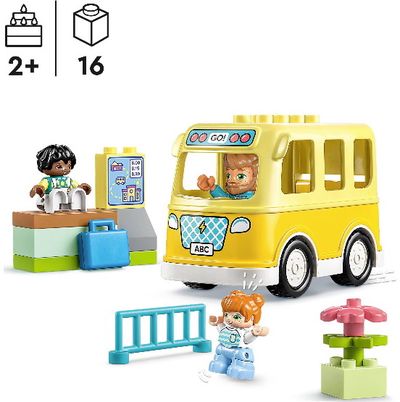LEGO DUPLO rinkiniuose yra įvairių personažų, kad maži vaikai galėtų žaisti draugaudami. Jie lavins smulkiąją motoriką atidarydami mokyklinio autobuso stogą ir įdėdami figūrėles viduje. Figūros stovi už tvoros, kai autobusas važiuoja, padeda ikimokyklinukams išmokti elgtis eismo sąlygomis. Kaip ir visi LEGO DUPLO mažylių žaislai, šis rinkinys suteikia neribotą linksmybę, saviraišką ir džiaugsmingą tyrinėjimą mažiems vaikams.