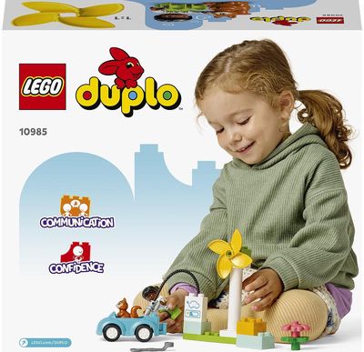 LEGO® DUPLO® Town Vėjo turbinos (10985) rinkinys įkraus mažylio žaidimą išradingomis pramogomis. Šis nebrangus žaidimo rinkinys, kurį sudaro įkrovimo stotelė, elektromobilis, žaislinis veržliaraktis ir inžinieriaus bei voverės figūrėlės, skatina mažulius iki 2 metų amžiaus žaisti vaidmenimis realų gyvenimą ir paprastai bei suprantamai mokytis gyventi tvariai.
