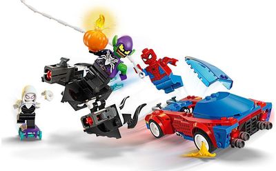 Žmogus voras, Vorė vaiduoklė ir venomizuotas Žaliasis goblinas įsitraukia į dinamišką kovą pasitelkdami nuostabų automobilį, ginklus ir priedus. Žmogaus voro automobilyje yra 2 priekinės smaigų šaudykles, Žaliasis goblinas turi skraidyklę su 2 smaigų šaudyklėmis ir moliūgo bombų, o Vorė vaiduoklė lekia riedlente ir šaudo 2 rankiniais voratinklio blasteriais. Žmogus voras siūbuoja ant lanksčios voratinklio virvės ir dideliu lanksčiu voratinkliu gaudo blogiukus. Automobilio dalis galima nuimti ir apžiūrėti jo vidų, kur telpa 2 figūrėlės ir riedlentė. Kad būtų dar daugiau skaitmeninių linksmybių, konstruotojai gali priartinti, pasukti trimačius modelius ir sekti pažangą naudodami smagią ir lengvai perprantamą programėlę „LEGO Builder“.