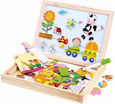 - dėlionė su magnetiniais elementais, kurią galima žaisti ant magnetinės baltos lentos arba nuo jos. Iš pateiktų elementų galite sukurti daugybę paveikslėlių ir motyvų. Iš pradžių vaikas gali nukopijuoti paveikslėlius iš pridedamų instrukcijų, mokydamasis juos kopijuoti, o tada pats gali susidėlioti naujus paveikslėlius, ugdydamas kūrybiškumą.