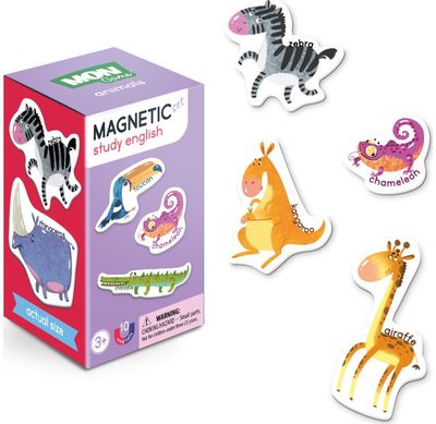 Žaismingas magnetų rinkinys. Prie kiekvieno magneto rasite anglišką pavadinimą, taigi vaikai kartu galės mokytis ir pavadinimų anglų kalba.