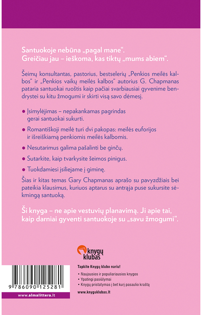 Šias ir kitas temas Gary Chapmanas aprašo su pavyzdžiais bei pateikia klausimus, kuriuos aptarus su antrąja puse sukursite sėkmingą santuoką.