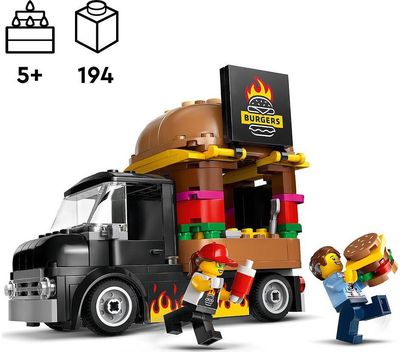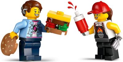 „LEGO® City“ žaidimo rinkinys „Mėsainių sunkvežimis“ (60404) – dovanėlė mažiesiems fantazuotojams nuo 5 metų. Milžinišku mėsainiu papuoštą greitojo maisto užkandinę ant ratų galima atkabinti nuo sunkvežimio, be to, ji turi detalią maisto gaminimo erdvę, pagardų ir langelį, kurį atidarius pasirodo iškaba su kepamo mėsainio vaizdu. Rinkinyje taip pat yra pardavėjo ir kliento su kochleariniu implantu figūrėlės.