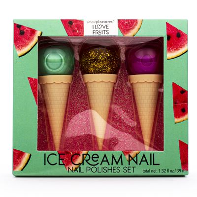 Žaismingoje pakuotėje rasite trijų skirtingų spalvų nagų lakus. Originalus dizainas - indeliai atrodo tarsi ledų porcijos.