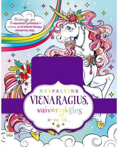 Paimkite į rankas neoninius žymeklius, blizgius klijus ir kurkite kerinčius piešinius. Tarsi pamojus burtų lazdele jums prieš akis atgis vienaragiai, vaivorykštės ir kiti fantastiški knygos paveikslai. Praskaidrinkite savo dieną – spalvinkite, kiek širdis geidžia.