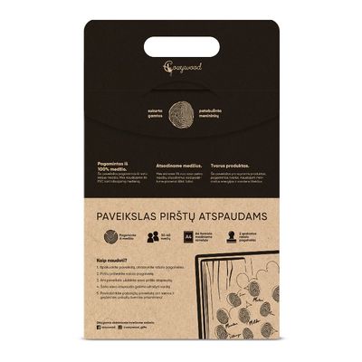 Atspausdinta ant natūralaus medžio, natūralios medienos rėmelis. Pridedamos dvi skirtingų spalvų rašalo pagalvėlės pirštų antspaudais dekoruoti paveikslą