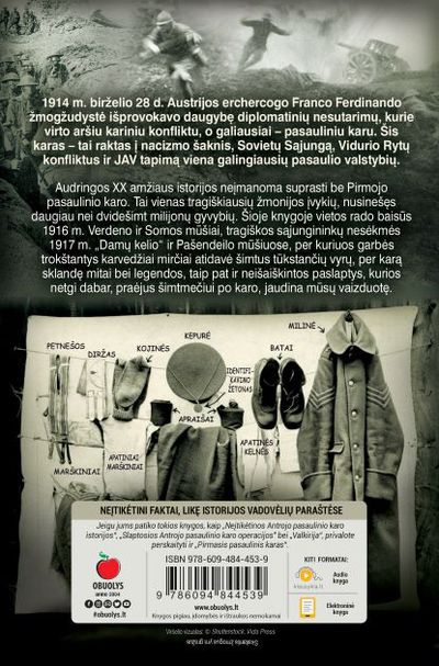 Audringos XX amžiaus istorijos neįmanoma suprasti be Pirmojo pasaulinio karo. Tai vienas tragiškiausių žmonijos įvykių, nusinešęs daugiau nei dvidešimt milijonų gyvybių. Šioje knygoje vietos rado baisūs 1916 m. Verdeno ir Somos mūšiai, tragiškos sąjungininkų nesėkmės 1917 m. „Damų kelio“ ir Pašendeilo mūšiuose, per kuriuos garbės trokštantys karvedžiai mirčiai atidavė šimtus tūkstančių vyrų, per karą sklandę mitai bei legendos, taip pat ir neišaiškintos paslaptys, kurios netgi dabar, praėjus šimtmečiui po karo, jaudina mūsų vaizduotę.
