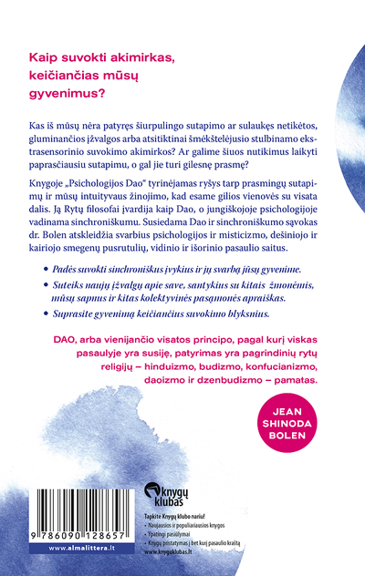 Knygoje „Psichologijos Dao“ tyrinėjamas ryšys tarp prasmingų sutapimų ir mūsų intuityvaus žinojimo, kad esame gilios vienovės su visata dalis. Ją Rytų filosofai įvardija kaip Dao, o jungiškojoje psichologijoje vadinama sinchroniškumu. Susiedama Dao ir sinchroniškumo sąvokas dr. Bolen atskleidžia svarbius psichologijos ir misticizmo, dešiniojo ir kairiojo smegenų pusrutulių, vidinio ir išorinio pasaulio saitus.