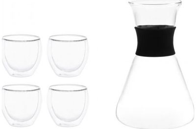 Vyno taurių ir grafino rinkinys. Dailių linijų grafinas ir dvigubo stiklo taurės atsparios karščiui leis stilingai mėgautis karštu vynu žiemos vakarais.