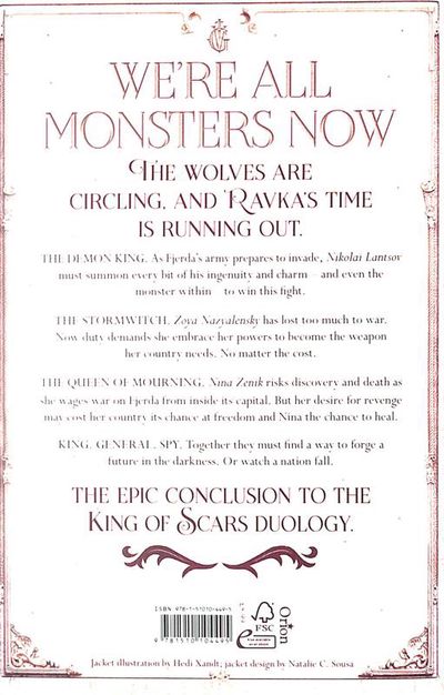 The Demon King. As Fjerda's massive army prepares to invade, Nikolai Lantsov will summon every bit of his ingenuity and charm - and even the monster within - to win this fight. But a dark threat looms that cannot be defeated by a young king's gift for the impossible.