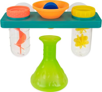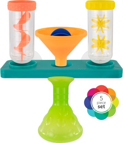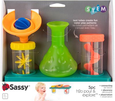 „Sassy“ daugiausia dėmesio skiria kūdikio vystymuisi per smagų žaidimo procesą! Ši 5 dalių vandens laboratorija – tai smagus vonios žaislas, skatinantis mažylį eksperimentuoti su vandeniu įsivaizduojamoje mokslinėje laboratorijoje. Spaustuku pritvirtinkite dėkliuką prie vonios sienelės, tada įstatykite du mėgintuvėlius ir piltuvėlį. Mažyliui pilant vandenį iš kolbelės į kiekvieną indą, jis gali stebėti vandens kelionę! Šis rinkinys – tai smagus būdas sujungti eksperimentus su vandens žaidimais.