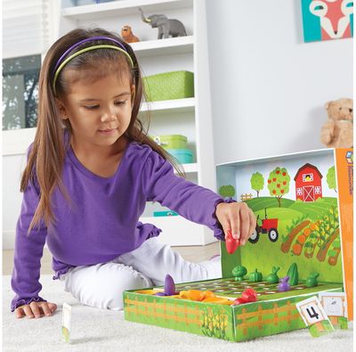 Šis įtraukiantis žaidimas ugdys spalvų ir formų atpažinimo, derinimo, rūšiavimo ir ankstyvo skaičiavimo įgūdžius. Tikroviškos plastikinės daržovių figūros yra penkių ryškių spalvų tai: brokoliai, kukurūzai, svogūnai, moliūgai ir kt. Vaikai mokysis naujo daržovių pavadinimų žodyno. Galima žaisti kartu su pridedamais daržovių krepšiais ir minkštųjų putų žaidimų kilimėliu. Rūšiuokite daržoves pagal spalvą, suskaičiuokite kiekvieną daržovių rūšį arba suderinkite spalvas ir formas su tomis, kurios pavaizduotos žaidimo kilimėlio ženkluose.