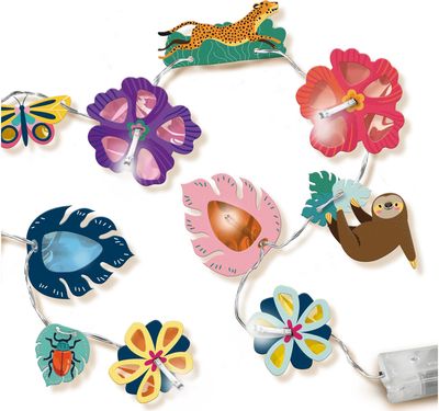 Pasigamink magišką džiunglių girliandą ir papuošk ja kambarį! Rinkinyje rasi girliandą su 8 LED lemputėmis, penkių spalvų celofaninius lapus, klijus, teptuką, džiunglių gyvūnus ir gėles – viską, ko reikia šauniai ir akį traukiančiai girliandai pasigaminti. Eidamas miegoti įjunk girliandą ir stebėk, kaip gražiai ji apšviečia tavo kambarį!