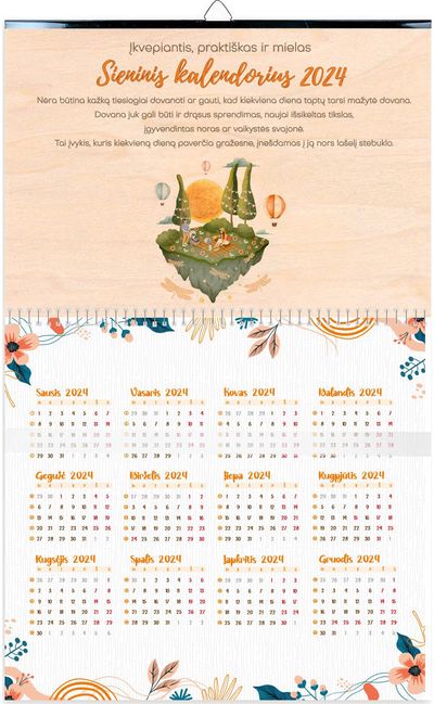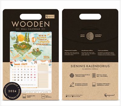 Įkvepiantis, praktiškas ir mielas sieninis kalendorius su mediniu viršeliu.