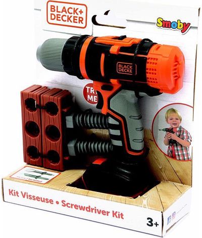 Žaislinis mechaninis grąžtas, kuris turi 2 antgalius. Pridedami du varžteliai ir dvi statybinės lentutės.