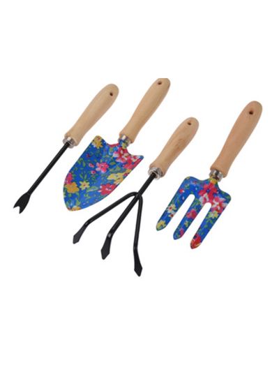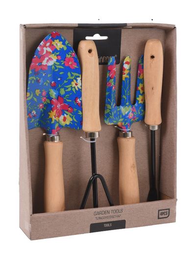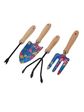 Spalvingai dekoruotas sodo įrankių rinkinys, kuriame - keturi, praktiški įrankiai augalų priežiūrai.