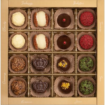 Rinkinyje rasite net 8 skirtingus saldainius su šiais įdarais: šampaniniu, karčiojo šokolado, pasiflorų, žemės riešutų kremo, mangų ir šafrano, žaliosios arbatos Matcha, taip pat marcipano su baltuoju šokoladu ir pekaninėmis karijomis bei šokolado su žiedadulkėmis.