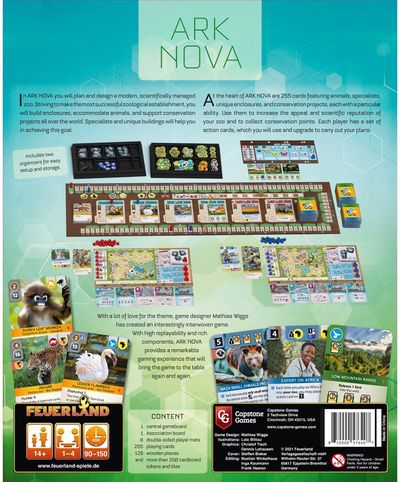 255 kortelės su gyvūnais, specialistais, specialiais aptvarais ir gamtosaugos projektais, kurių kiekvienas turi ypatingų gebėjimų, yra "Ark Nova" pagrindas.