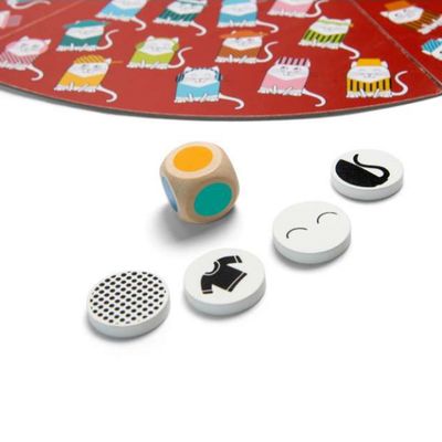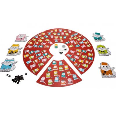 Pažiūrėkite į kauliukus ir žetonus, ir išsiaiškinkite, kurią katę jums reikia rasti. Plytelių raštai ir kauliuko spalva rodo, į ką turėtumėte atkreipti dėmesį. Ar radote tinkamą katę? ŽAIDIMO EIGA: 1. Sudėkite visas lentos dalis viduryje stalo. 2. Įdėkite žetonus lentos centre 3. Duokite kiekvienam žaidėjui didelės katės kortelę. Pradeda ilgiausiai galintis miaukti žaidėjas. Jis meta kauliukus ir meta žetonus juos gali mesti po vieną arba visus kartu. Pažiūrėkite į žetonus ir kauliukus, kad sužinotumėte kokios katės lentoje turite ieškoti. Sujunkite visus kauliuko ir žetonų požymius ir raskite pirmas reikalingą katę. Raštas (taškai arba juostelės) visada yra ant megztinio ARBA kepurės. Visi žaidėjai ieško vienu metu. Jeigu žetone pavaizduota skrybėlė tai gali būti bet kokie galvos apdangalai: skrybėlė, kepuraitė, ausinės. Jeigu esate pirmas radęs tinkamą katę ir didžiosios katės kortelės galite užsidėti sagą. Laimi pirmas surinkęs 7 sagas.