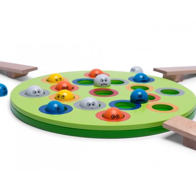 Sumeskite monstrus į skylutes. Laimi tas, kas pirmasis nuskraidina savo monstrus į vietas. ŽAIDIMO EIGA: Kiekvienas žaidėjas išsidalina vienodos spalvos tramplynus ir monstrus. Pastatykite žaidimo lentą viduryje, tramplynus sustatykite aplink žaidimo lentą, o monstrą padėkite ant tramplyno galo. Ranka spustelkite trumpąją tramplyno dalį ir monstras skris. Jeigu monstras įkrenta į skylute - šaunu, bet jeigu pataikote į lentos vidurį - jūsų monstras iškrenta iš žaidimo. Jeigu monstras nukrenta šalia lentos arba nepataiko į skylute - galite bandyti dar kartą. Sudėtingesniu žaidimui galima bandyti pataikyti monstrą tik į jam priklausančios spalvos skylutę. Laimi pirmas sumetęs visus savo monstrus.