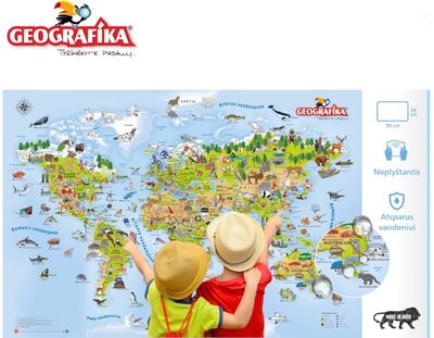 Tyrinėkite pasaulį: „Vaikiškas pasaulio žemėlapis“ yra įdomus būdas mokyti vaikus apie pasaulį, kuriame gyvename. Šiame žemėlapyje yra daugiau nei 280 iliustracijų, taip pat šalių, upių, ežerų, vandenynų, žinomiausių objektų, žinduolių, roplių, varliagyvių, paukščių. Jame galite pamatyti gausybę įvairiausių gyvūnų ir įžymių vietų, festivalių, sportų ar patiekalų!