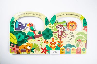 0–3 metų vaikams skirta knygelė – labai smagi pirma pažintis su įvairiais džiunglių gyvūnais. Mažylių dėmesį patrauks ryškios ir spalvingos iliustracijos, bus įdomu klausytis skaitomo nuotaikingo rimuoto teksto ir bandyti atkartoti žvėrelių garsus. Be to, kiekviename puslapyje vaikai turės surasti ir atpažinti aiškiai puslapiuose nurodytus žvėrelius.